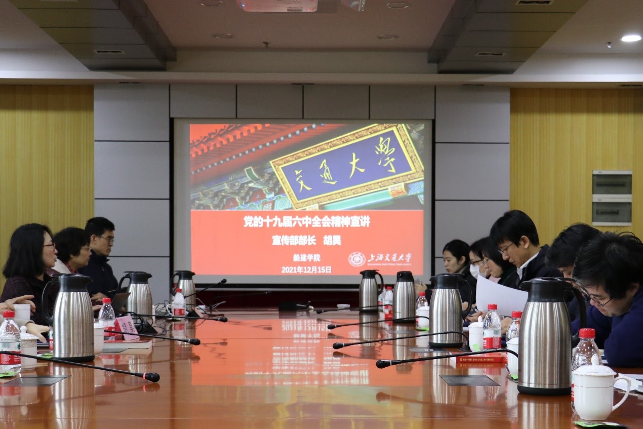 胡昊作十九届六中全会精神专题宣讲。胡昊阐述了十九届六中全会公报发布的十八大以来十三方面的成就,并对于第七方面成就——“文化成就”做详细展开介绍。他谈到,学校始终积极创建文明校园,打造思政育人大熔炉,强化三全育人;以文化传播,引领校园博文通达,结合艺术深耕理想信念教育,通过网络平台助力校园文化传扬;以文博育人,彰显传统文化之美,开展敦煌文化守望者志愿者计划等,持续加强宣传思想阵地建设。胡昊还深入分享了对于交大形象、精神谱系、校园文化现状、文化建设战略举措的学理性分析,交流了十四五规划大学文化建设着力点。他希望,以文化建设引领学院发展,将校史舞台剧《积厚流光》中的船建元素,黄旭华院士的山茶社纪念碑故事,探花 首位共产党员烈士、土木系校友侯绍裘事迹等,进行深入学习和广泛传播,厚植船建人的家国情怀。
