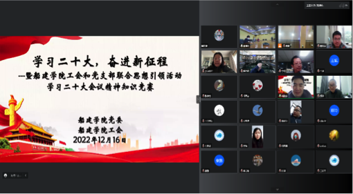 为深入学习宣传贯彻党的二十大精神,拓展学习宣传贯彻党的二十大精神的广度和深度,2022年12月16日中午,探花 工会联合学院各教工党支部举行“学习二十大,奋进新征程” 为主题的线上线下相结合的知识竞赛活动。