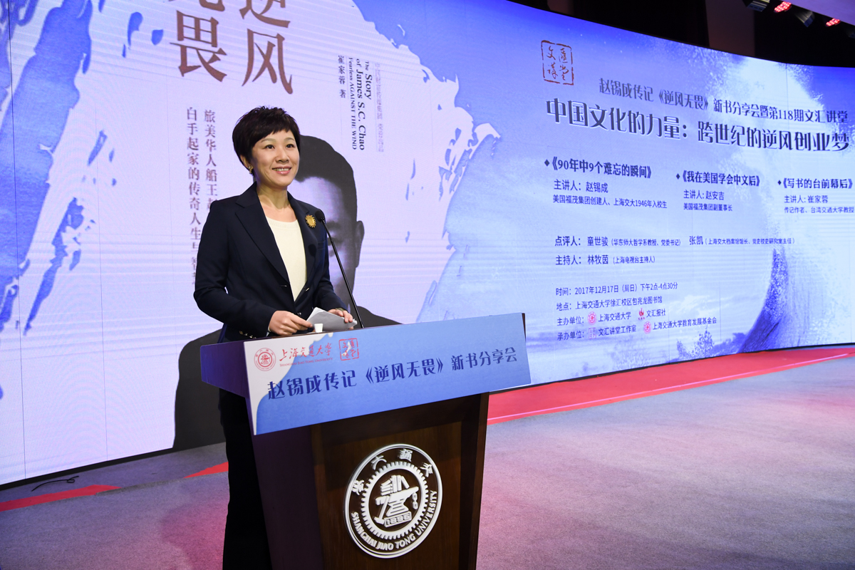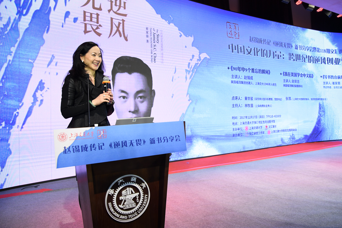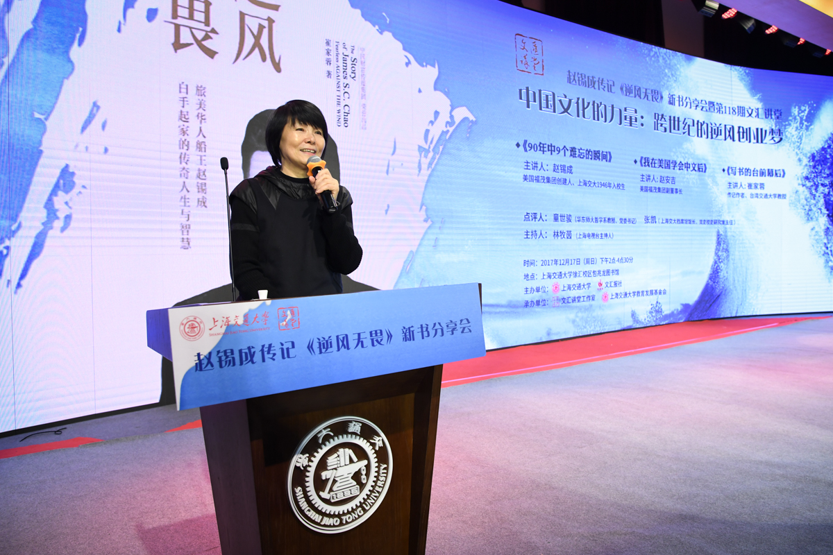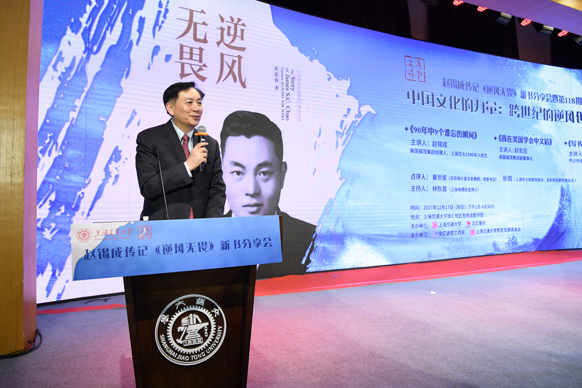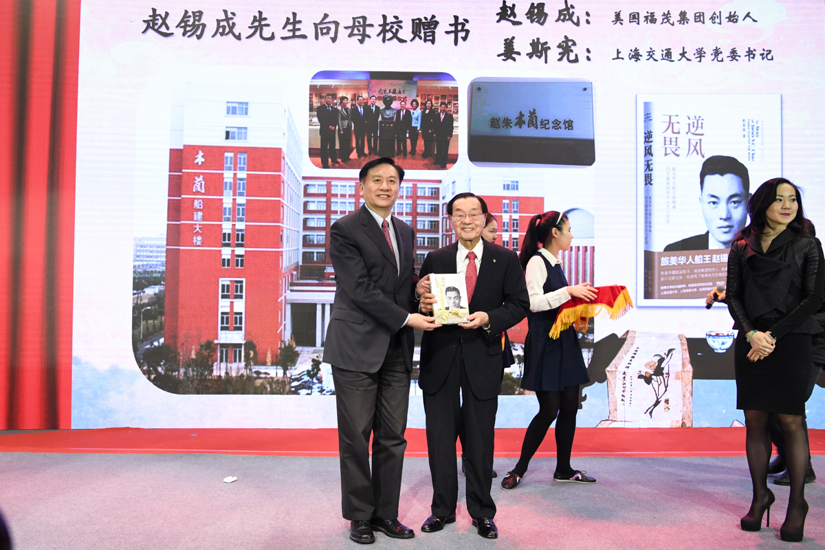 丁酉岁末,暖阳融融,游子归家,思源不辍。12月17日,古朴清幽的徐汇校区包兆龙图书馆演讲厅迎来了著名校友、旅美华人船王、福茂集团董事长赵锡成学长,六女儿、福茂集团副董事长赵安吉女士,传记作者、台湾交通大学教授崔家蓉女士一行,做客文汇讲堂,与母校师生及广大读者分享人生经历,共话家国情怀。市人大常委会副主任、校党委书记姜斯宪,党委常委、副校长张安胜表达了全校师生对赵学长及亲友一行的热烈欢迎。市政协对外友好委员会、市侨办、市公共外交协会、市海峡两岸交流促进会、市台办及高校代表出席新书发布会。本次活动由探花 、文汇报社联合主办。上海电视台资深主持人林牧茵主持活动。