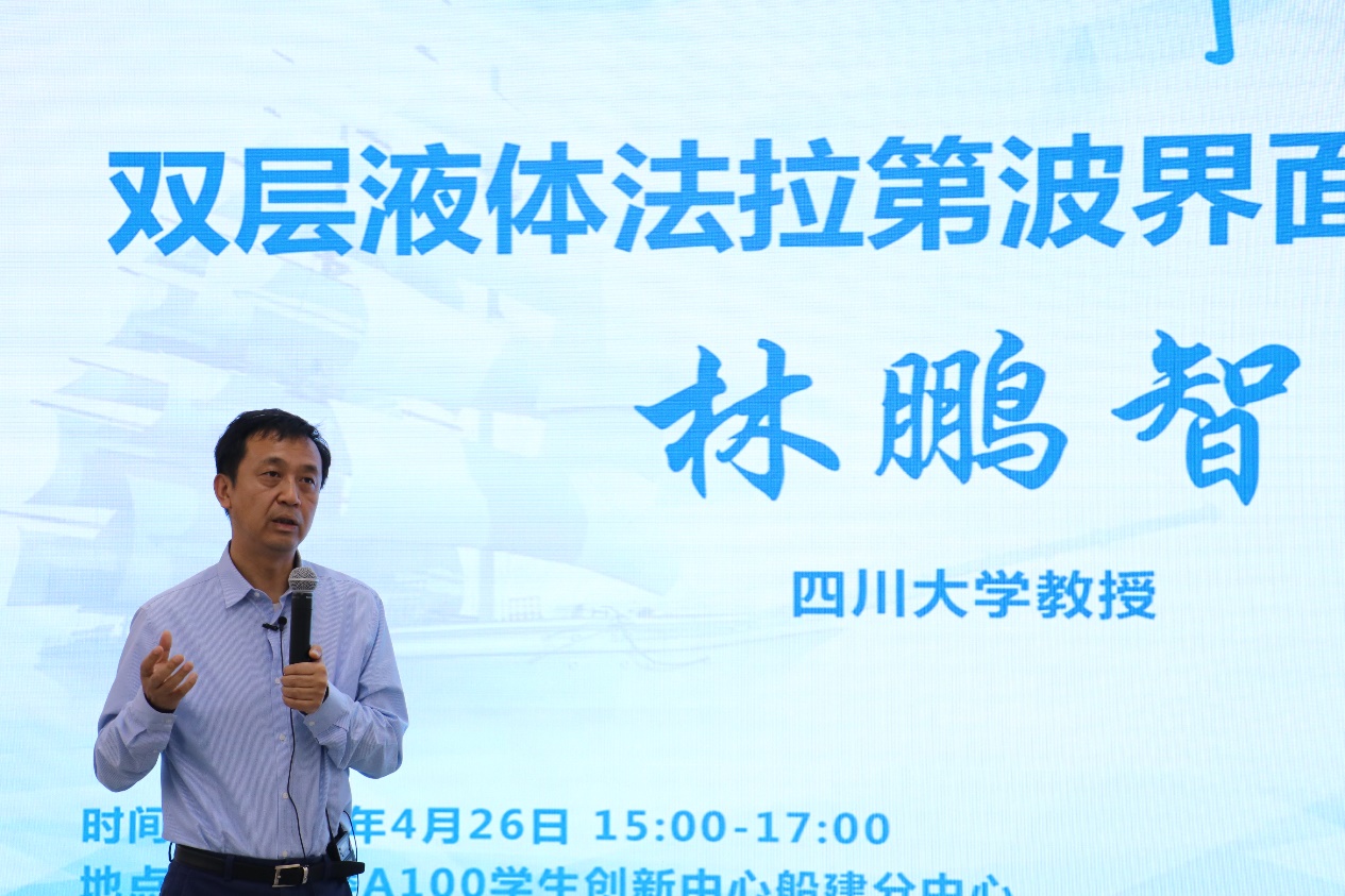 4月26日下午,四川大学林鹏智教授来到上海交大探花 ,做客第三期“旭华讲坛”,为船建师生作题为“双层液体法拉第波界面失稳研究”的报告。院长廖世俊出席,副院长王本龙主持会议,学院内外80余名师生参与了本场讲坛。