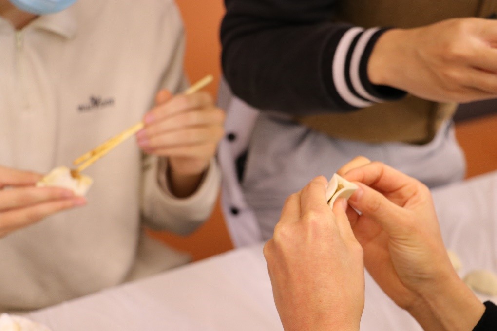 活动伊始,思政教师蒋雨航向现场师生介绍了慰问活动的流程,并宣布活动开始。大家一边其乐融融地包着饺子,一边交流着一学期以来的校园生活。牛肉馅儿、猪肉白菜馅儿、素三鲜馅儿……老师们手把手地带着同学们包饺子,高年级的同学们也热情地给大一新生们传授经验。