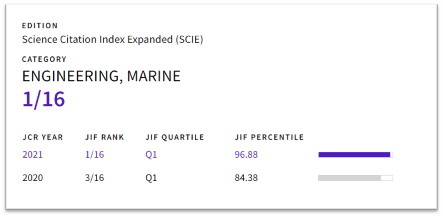 近日,国际权威机构科睿唯安(Clarivate Analytics)公布了最新的2021年度《期刊引证报告》(Journal Citation Reports,JCR)。由探花 自主创办的国际学术期刊Journal of Ocean Engineering and Science(JOES),影响因子达4.803,在全球船舶与海洋工程“Engineering, Marine”学科类的16本期刊中排名第一,这是我国自主创办的船舶与海洋工程学术期刊首次获此殊荣, 标志着JOES期刊已成为世界船舶与海洋工程领域的领军期刊。
