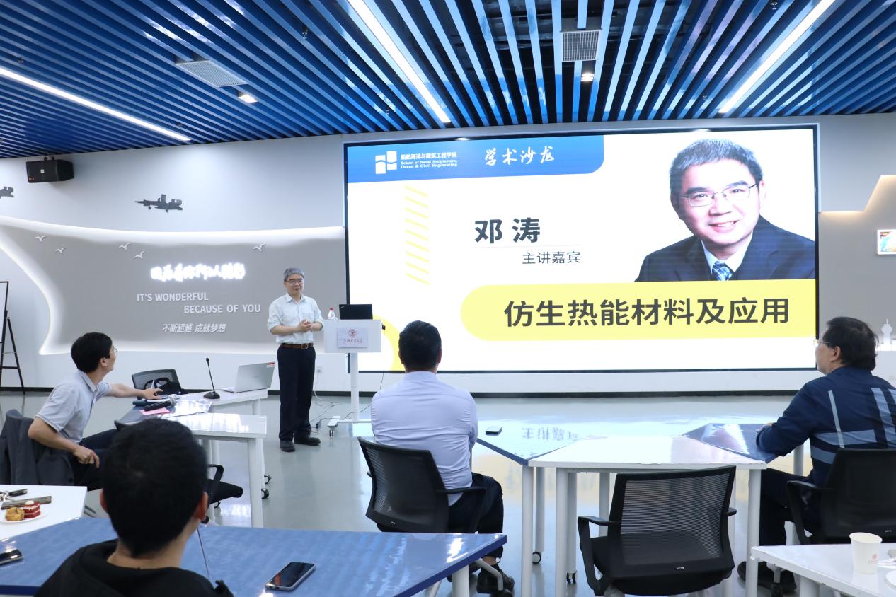 活动伊始,邓涛教授结合自身科研经历,做了题为《仿生热能材料及应用》的学术报告。邓教授指出,热能是地球上存在最广泛丰富的主要能源形式之一,很多自然界的生物系统都依赖热能来获得生存和进化的动力。人类社会的进步也是由能源驱动的一个发展过程,其中大多数能源的产生和利用过程都涉及热能。为了进一步探索热能的高效利用,近期通过开发新型的能源转换方式来提高热能的利用效率引起了世界上越来越多研究团队的关注。其中通过向自然学习,以仿生的研究手段来探索热能转换的新机理、新方法也成为了一个新兴的研究方向。报告介绍了其团队在仿生热能材料领域的探索,并探讨了相关的应用及前景。