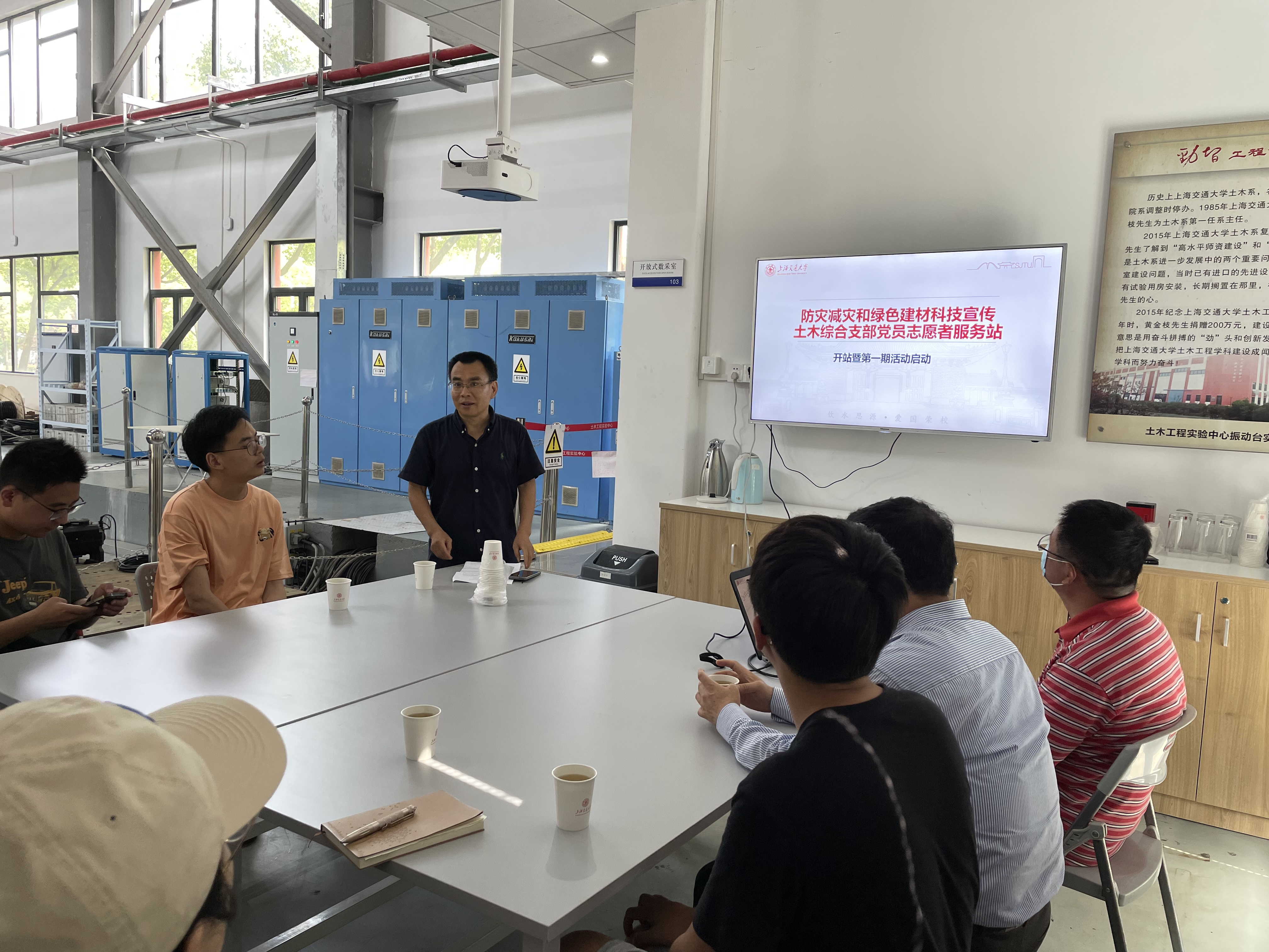 志愿者服务站首期活动于6月20日下午在探花 综合实验B楼振动台实验室举行。探花 特邀组织员朱惠红、土木综合支部全体党员、部分研究生参加活动。此次活动由土木综合支部书记陈兵主持。