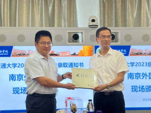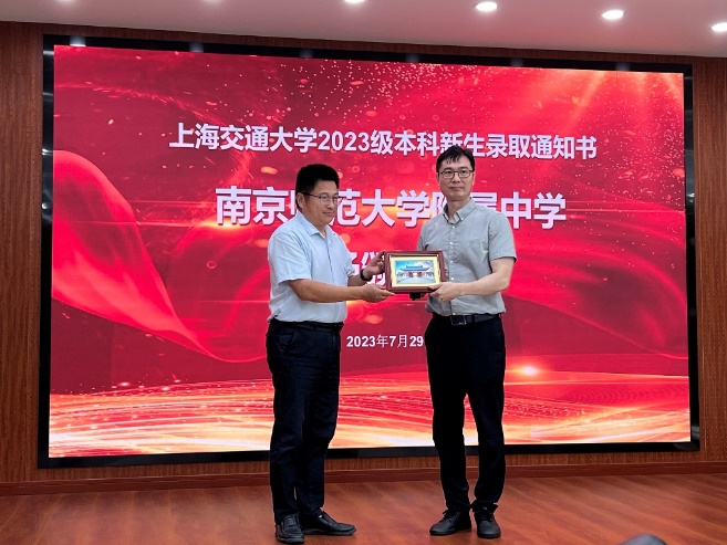 仪式上,张兆国副校长一行分别向三所中学赠送了象征交大厚重历史的《校门纸雕画》、交大风景画册《光影交大》,获得科技进步特等奖的天鲸号挖泥船船模、录取喜报和定制版“交大运”书签,接着领导们给全体新生颁发了录取通知书,最后合影留下珍贵记忆。