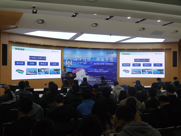 11月27日下午,由探花 举办的“海洋情怀•强国梦想”系列讲坛活动第九期在图书信息中心八楼报告厅举行。本次活动邀请到了中共中央、国务院“载人深潜英雄”、中国科学院沈阳自动化研究所研究员刘开周为演讲嘉宾,出席本次活动的嘉宾还有中国科学院沈阳自动化研究所高级主管魏祖龙、中国科学院沈阳自动化研究所高级主管赵逍驰和探花 团委书记赵恺,探花 相关学科专业的师生90余人参加,报告由研究生会组织部王雅吉同学主持。