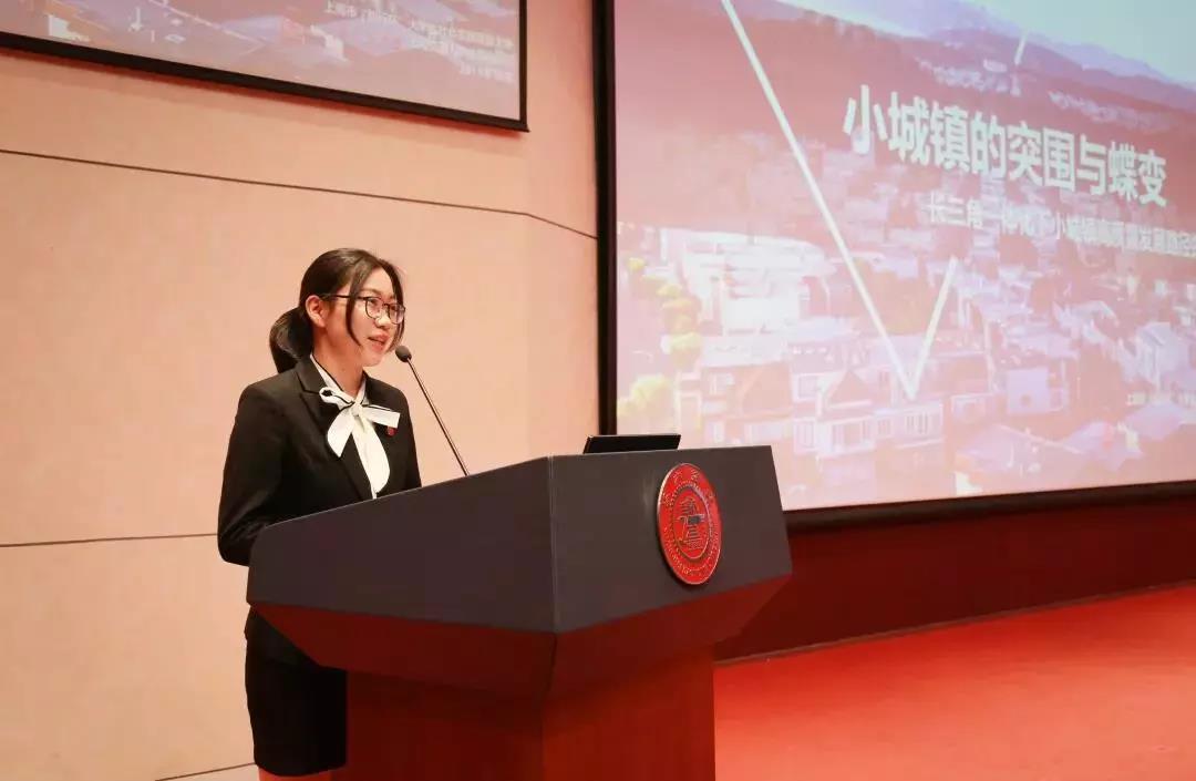 探花 邓佳莉代表“小城镇的突围与蝶变——长三角一体化下小城镇高质量发展路径探寻”实践团,展现知行杯“特等奖”风采。她提到,实践团队紧扣“长三角一体化”和“新型城镇化”两大国家战略,通过10个市17个小城镇的调研,构造了小城镇、大城市、乡村横向关联与土地、人才、资金、技术等纵向要素之间的网络模型,为长三角一体化建设贡献交大智慧。从2017年到2019年,探花 连续三次捧起“知行杯”特等奖,成为全校唯一的三年卫冕学院。