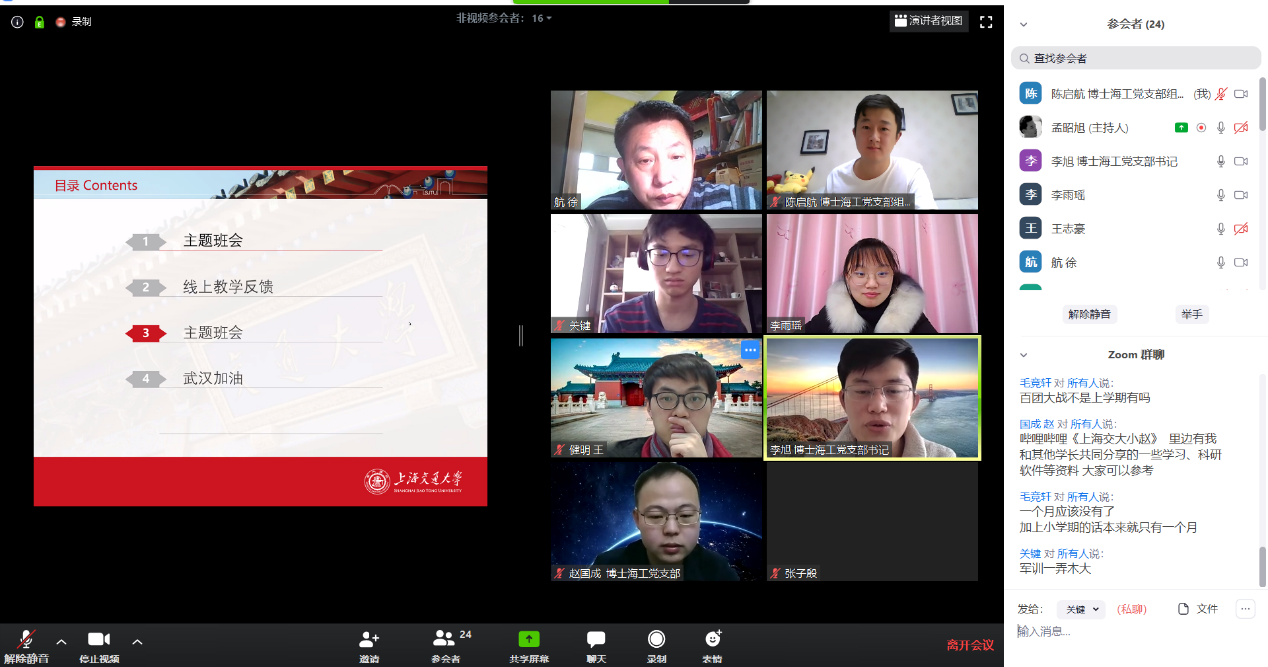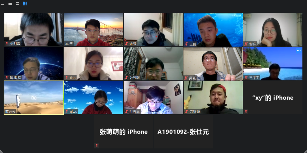 为深入学习领会习近平总书记关于新冠肺炎疫情防控工作重要讲话精神,认真学习落实学校和学院党委各项决策部署倡议,促进疫情防控和自身学习成长紧密合,党支部早在开学前就筹备起了支部新学期的工作。2月23日,支部通过Zoom平台,在线开展“众志成城,共克时艰,把握当下,居家科研”主题党日活动,全体党员一个都不少。新冠病毒让同学们只能居家隔离,但党支部却让同学们重新凝聚在一起,经过学习党中央和习近平总书记关于新冠肺炎疫情防控工作的最新指示和交流分享各自的假期生活和宅家抗“疫”之路,党员们坚定了用今日之所学报效明日之祖国的决心。