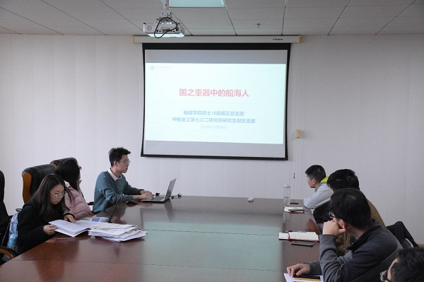 硕士18级第五党支部书记杨冲霄分享了支部共行计划的经历与感悟体会。他从“破冰之旅,缘聚交大”、“暑期实践,相会无锡”、“追忆初心,共赴南京”三个板块介绍了和七〇二所的三次共建交流活动。过去一年里,支部通过红色基地实践教育、企业调研、校友座谈采访、拓展运动会等方式增进支部交流,强化对专业和行业的认知,彰显出国之重器下的船海人的责任与担当。他号召大家利用好学校提供的平台,亲近社会,关注基层单位、重点行业单位,与祖国发展同向同行。