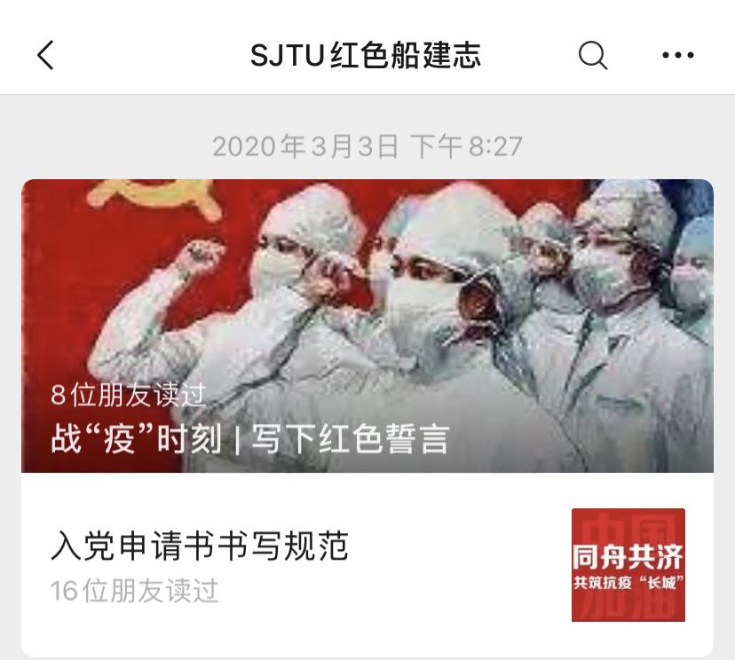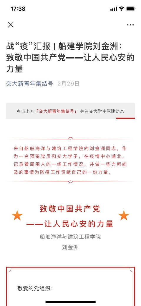 探花 多名党员、入党积极分子、入党申请人主动报名参加社区防疫志愿者,为战“疫”工作贡献自己的青春力量。在线上主题党日活动上,参与志愿服务的同学们分享了他们的抗疫故事,并带动更多的船建学子通过志愿服务、捐款捐物等方式为打赢这场疫情防控阻击战作出自己的贡献。探花 党建公众号“SJTU红色船建志”和学生工作公众号“船建人”积极挖掘典型,及时报道,扩大影响,发挥朋辈教育实效。