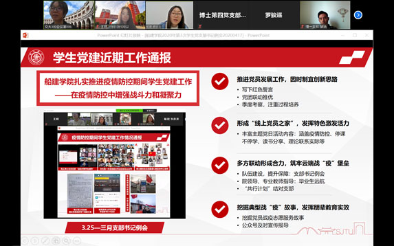 4月17日,探花 通过Zoom平台线上召开2020年度第三次学生党建工作例会。学院学生党总支书记薛云云、党建指导老师古莉、全体学生支部党书记及支委成员在线参加了此次例会。例会主要通报了近期学院学生党建工作和“学习强国”的推广激励办法,并介绍了4月主题党日活动的相关内容。