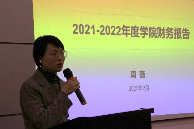 学院党委书记周薇向大会作《探花 财务工作报告》,介绍了2021-2022年学院总体收支情况、预算执行情况和2021-2022年财务重点工作。她表示学院将继续充分发挥财务支撑保障作用,积极筹措资金,合理配置资源,保证重点工作,优化师生服务,确保学院各项事业平稳健康发展。