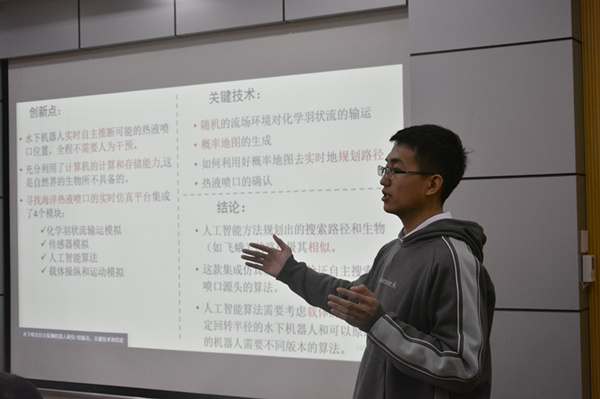 随后八支队伍先后进行了展示,并回答了专家提问。经过激烈角逐,大赛评选出一等奖1项,二等奖2项,三等奖3项。其中,作品“新型深海海底集矿装备设计”荣获一等奖。