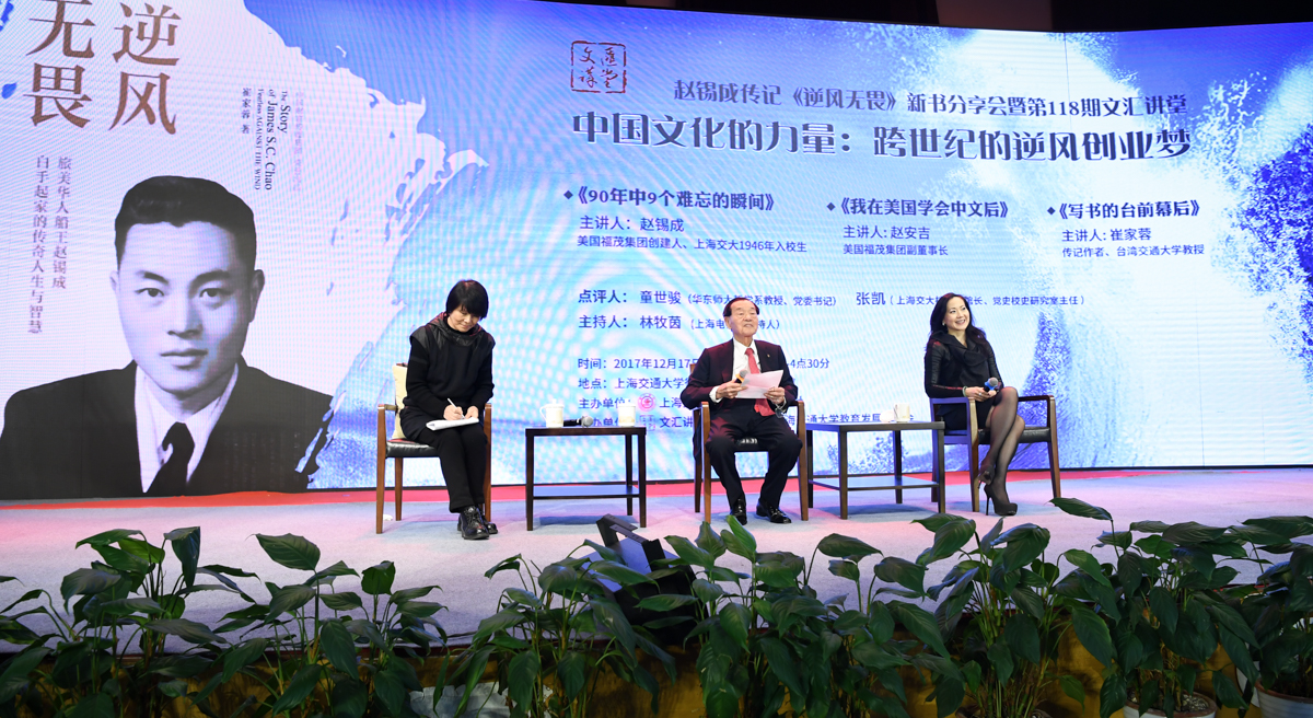 丁酉岁末,暖阳融融,游子归家,思源不辍。12月17日,古朴清幽的徐汇校区包兆龙图书馆演讲厅迎来了著名校友、旅美华人船王、福茂集团董事长赵锡成学长,六女儿、福茂集团副董事长赵安吉女士,传记作者、台湾交通大学教授崔家蓉女士一行,做客文汇讲堂,与母校师生及广大读者分享人生经历,共话家国情怀。市人大常委会副主任、校党委书记姜斯宪,党委常委、副校长张安胜表达了全校师生对赵学长及亲友一行的热烈欢迎。市政协对外友好委员会、市侨办、市公共外交协会、市海峡两岸交流促进会、市台办及高校代表出席新书发布会。本次活动由探花 、文汇报社联合主办。上海电视台资深主持人林牧茵主持活动。