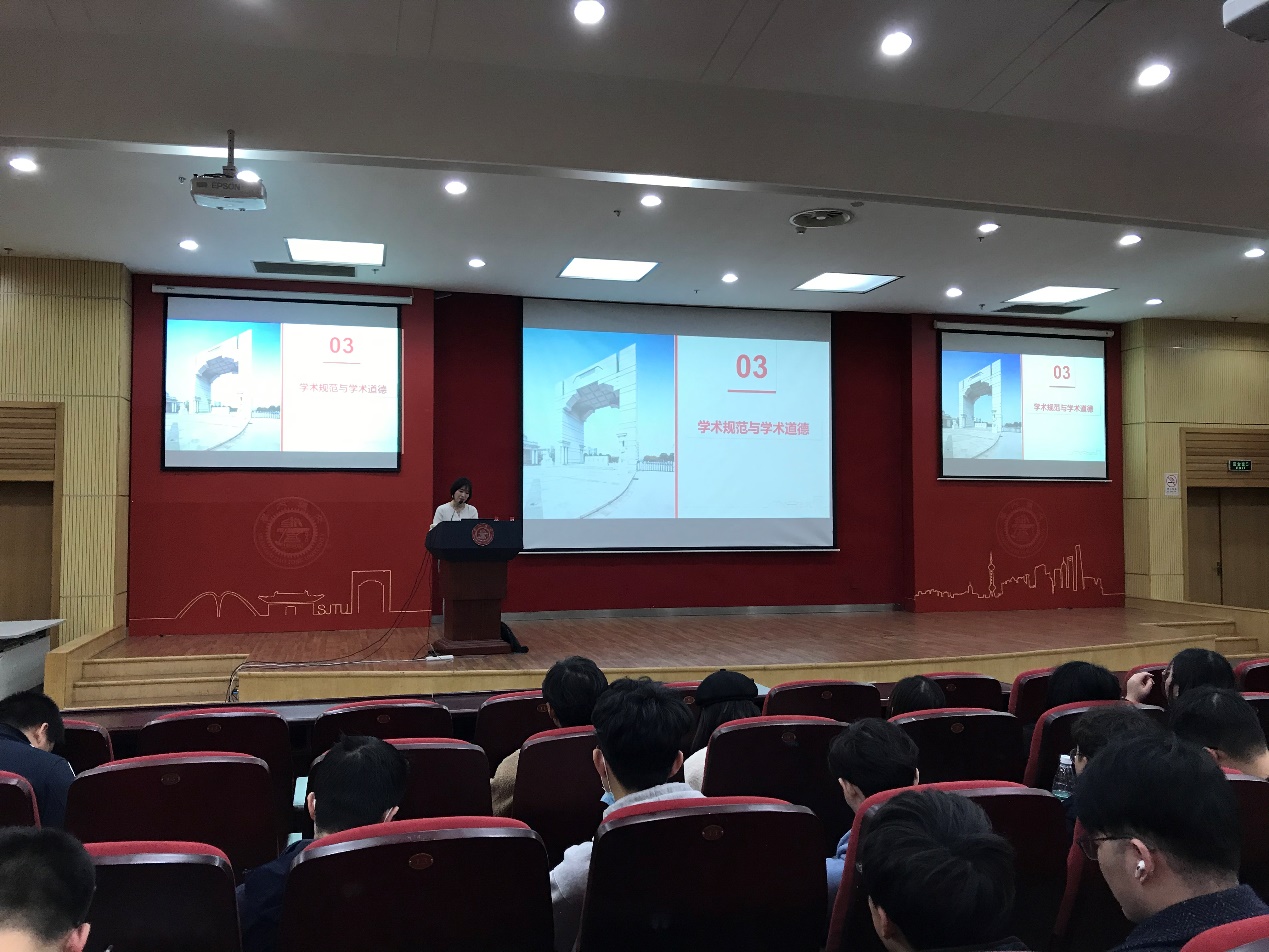余婷婷详细讲解了写作的规范流程及要求,介绍文献调研方法的要点和技巧,推荐了知网、万方、超星百链等学术资源数据库,拓展了同学们获取学习资源的渠道。蔡文静介绍了交大版学术规范准则,列举事实案例,与同学们探讨剖析学术不端行为。她还介绍了文献管理软件NoteExpress,帮助同学提高写作效率。