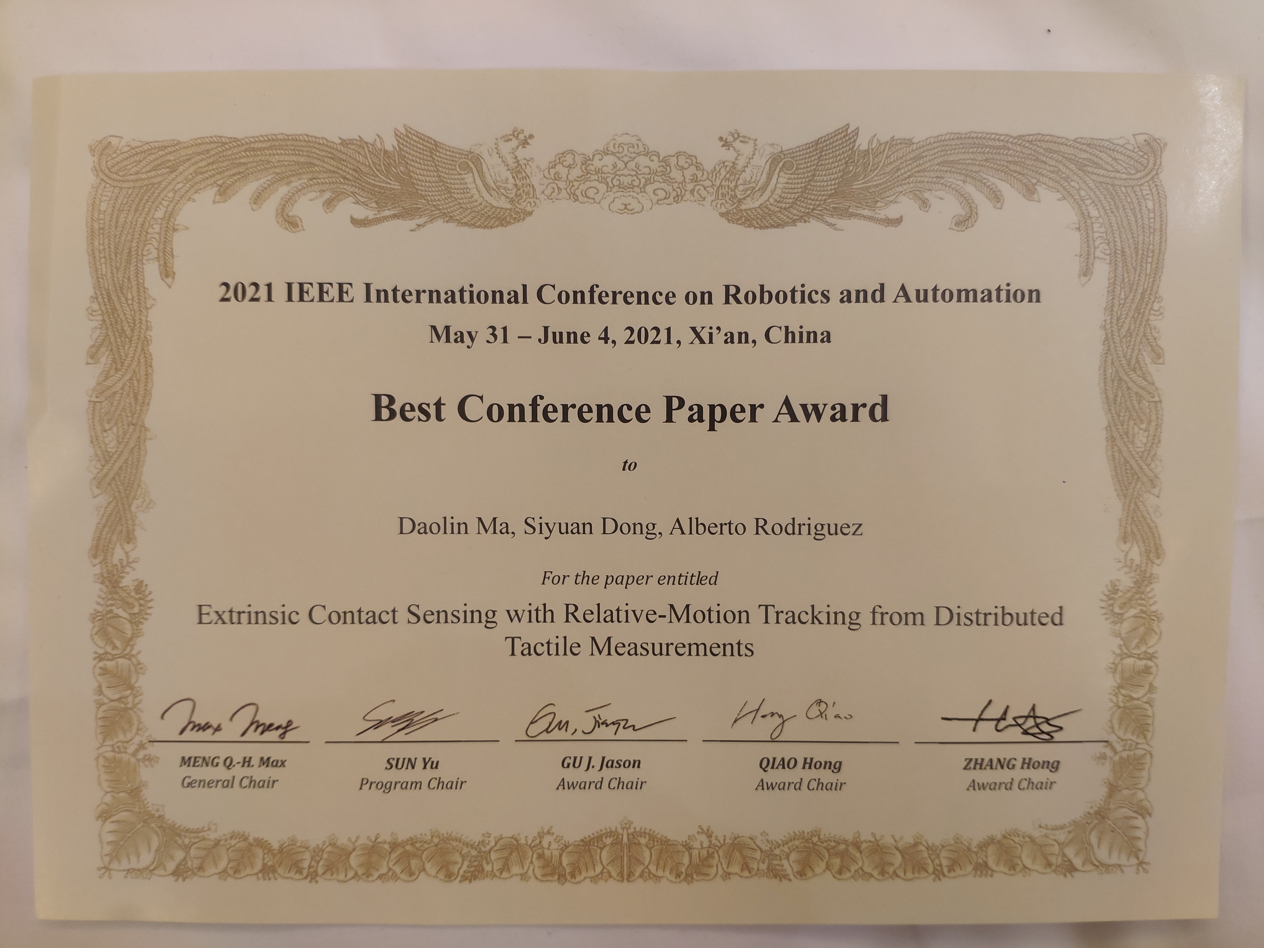 近日,机器人技术领域最有影响力的国际学术会议之一ICRA2021在中国西安召开,探花 工程力学系副教授马道林获得本次大会最高荣誉——最佳会议论文奖。