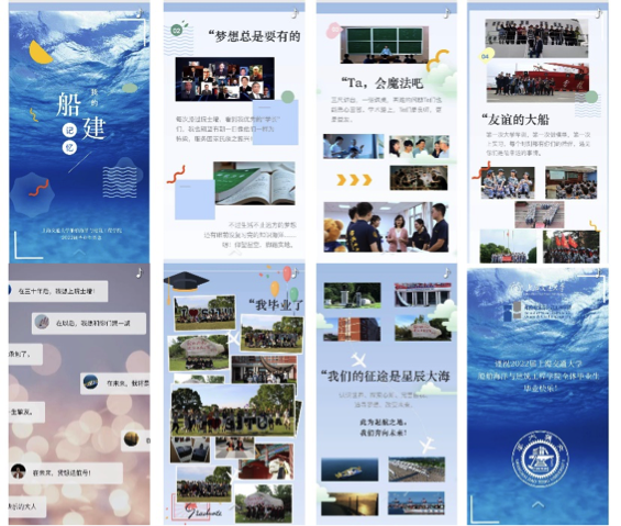 毕业典礼前夕,一场“我的船建记忆”H5伴随毕业生们追忆似水年华。“同学你好”“梦想总是要有的”“Ta,会魔法吧”“友谊的大船”“成长成长”“时间来到今天”等篇章,通过一幅幅画面、一幕幕场景,再现追梦时光。交大是梦想中的学府,船建是梦想开始的地方,迈向未来,毕业生们又希望点亮哪些温暖的记忆、诉说哪些美好的希冀呢?在互动中,学生可自由填写,为自己留下专属的光芒印记。“在交大,我曾遇到一生的挚友”“三十年后,我想上院士墙!”“在以后,我想和你们聚一聚” ······那些珍藏于心的一个个真挚的故事和愿望,将汇聚成无穷的能量护航。