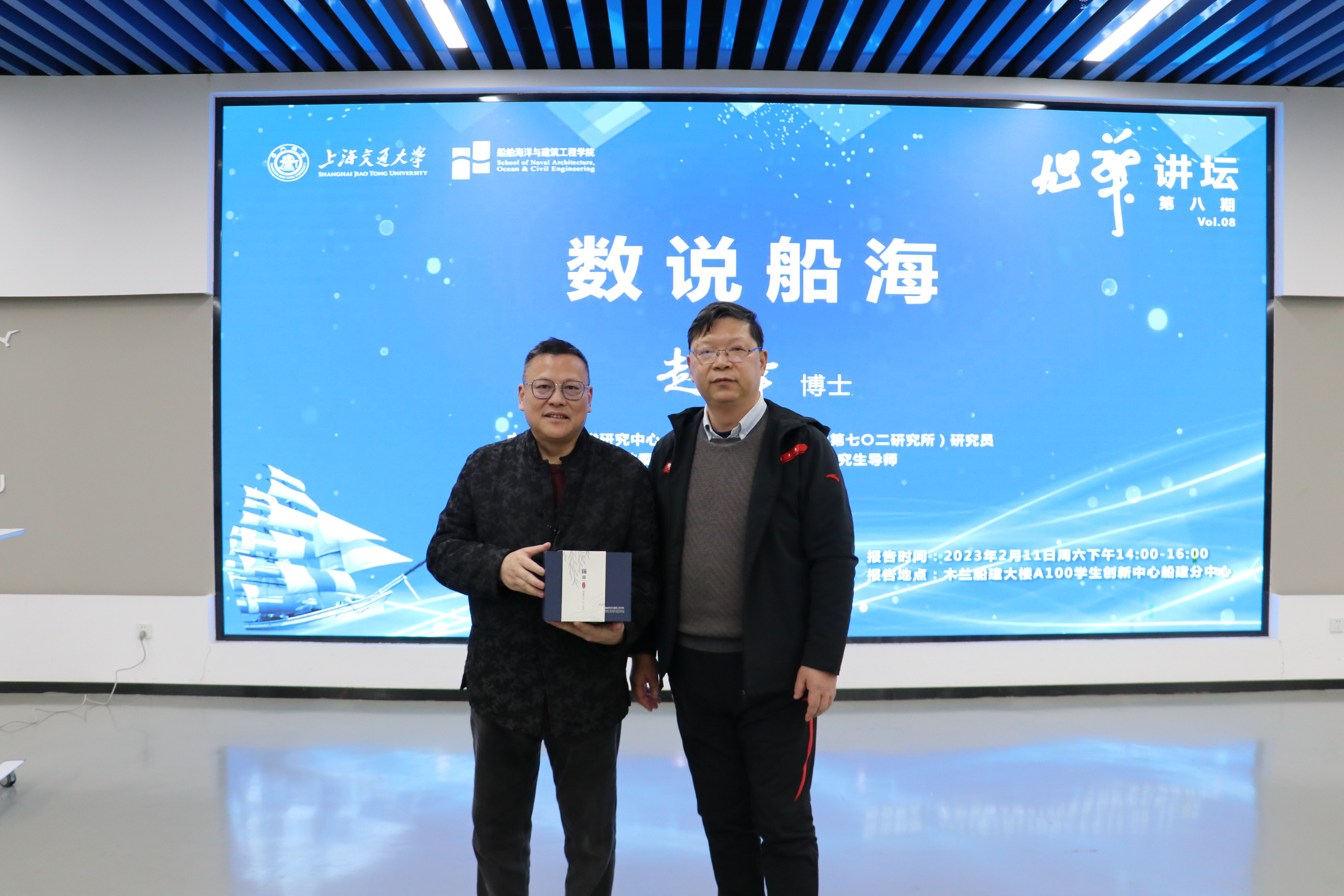 廖世俊院长对赵峰研究员的精彩报告进行了点评。他指出,中国船舶科学研究中心向高校展示了一种新的技术研发范式。华为正是通过研发创新的范式转换成为了行业的领导者,中国如果有一千个华为,中国将立于世界创新的先锋,期待船海领域成为另外一个创新模式的成功案例。最后,廖世俊院长代表探花 向赵峰研究员赠送了“旭华讲坛”纪念品,对他的精彩报告和感悟分享表示由衷的感谢和祝福。