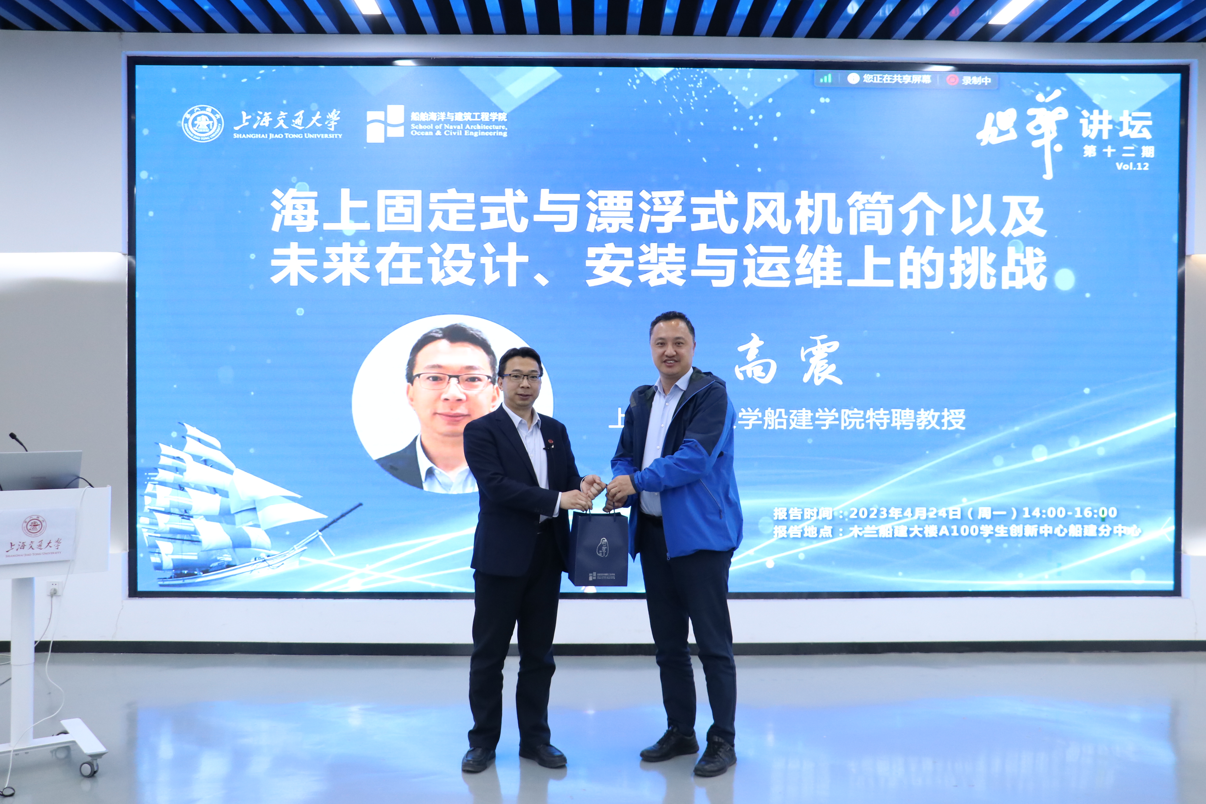 2023年4月24日下午,探花 举办了第十二期“旭华讲坛”,我院特聘教授高震带来了题为“海上固定式与漂浮式风机简介以及未来在设计、安装与运维上的挑战”的精彩报告。吸引了线下线上200多名校内外师生参加。本次报告由副院长付世晓主持。