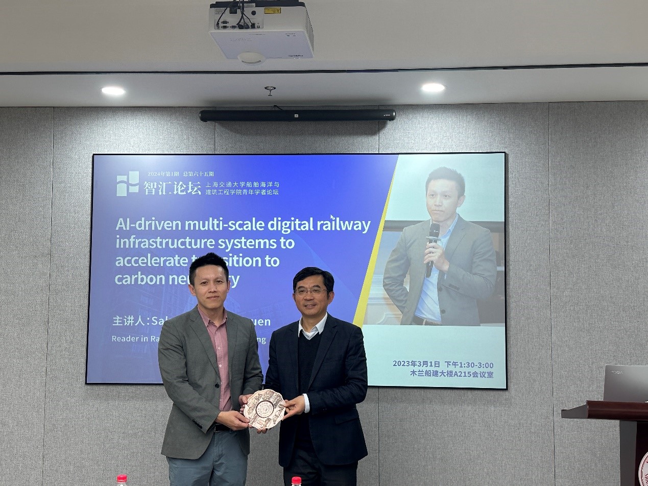 报告结束后,在场师生热情提问并与Kaewunruen教授进行深入探讨和交流。最后,工程管理研究所所长胡昊教授代表学院向Sakdirat Kaewunruen教授赠送纪念品,对他本次来访表达由衷感谢。