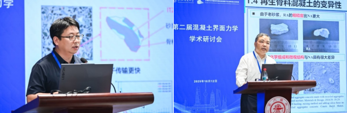 会议设四个主题报告单元,分别由周小平、蒋正武、陈兵和张大旭教授主持。在“混凝土界面表征”环节,华北水利水电大学副校长李伟华教授介绍了基于再生尾粉的无机涂层及其性能表征及应用;东南大学蒋金洋教授展示了从纳观到细观的全尺度界面研究与相关预测方法;清华大学魏亚教授探讨了界面过渡区(ITZ)的微纳米表征测试手段及跨尺度模拟的重要性。