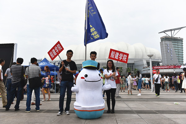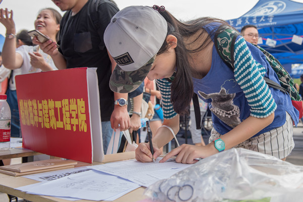 早上7点,团学志愿者在新体摊位集合迎接新生的到来,并为新生精心准备了新生礼包和免费矿泉水。学院签到摊位旁,由志愿者装扮的学院吉祥物人形玩偶凭借可爱的造型成为学院醒目的标识,并引来许多前来签到的新生合影留念。除了在摊位上负责签到的志愿者外,还有一部分同学在新体育馆各个重要的入口和标志物前高举探花 的院旗、院牌,为前来报道的新生进行引导。