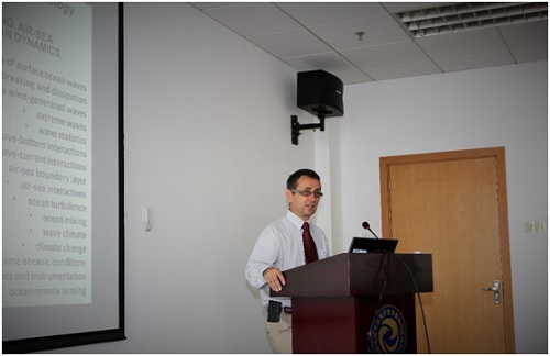 学院副院长马宁代表学院对Babanin教授的到来表示热烈欢迎。Babanin教授在报告会上介绍了斯威本大学的基本情况与海洋研究设施,并对该校海洋科技工程中心在海洋科学方面的研究工作进行了详细介绍。据了解,该研究中心的研究领域包括各种尺度的波浪模拟、波流相互作用、波谱模型的改进等,还开展了由波浪导致的海洋表面的混合现象的研究,例如波浪破碎以及由海底至表面的低温水体对气候的影响等。海洋表面的混合现象研究有助于进一步了解海洋-大气间的相互作用,从而有助于波浪模型和全球气候模型的研究。此外,Babanin教授还重点介绍了其在全球波候方面的研究,通过对近23年来的卫星数据进行分析表明全球的海洋表面风速有增大的趋势,从而导致全球海洋波浪波高的增加。相关研究成果发表在国际顶级期刊《Science》上。Babanin教授的讲座言语生动,内容详实,引起了在座师生的浓厚兴趣。