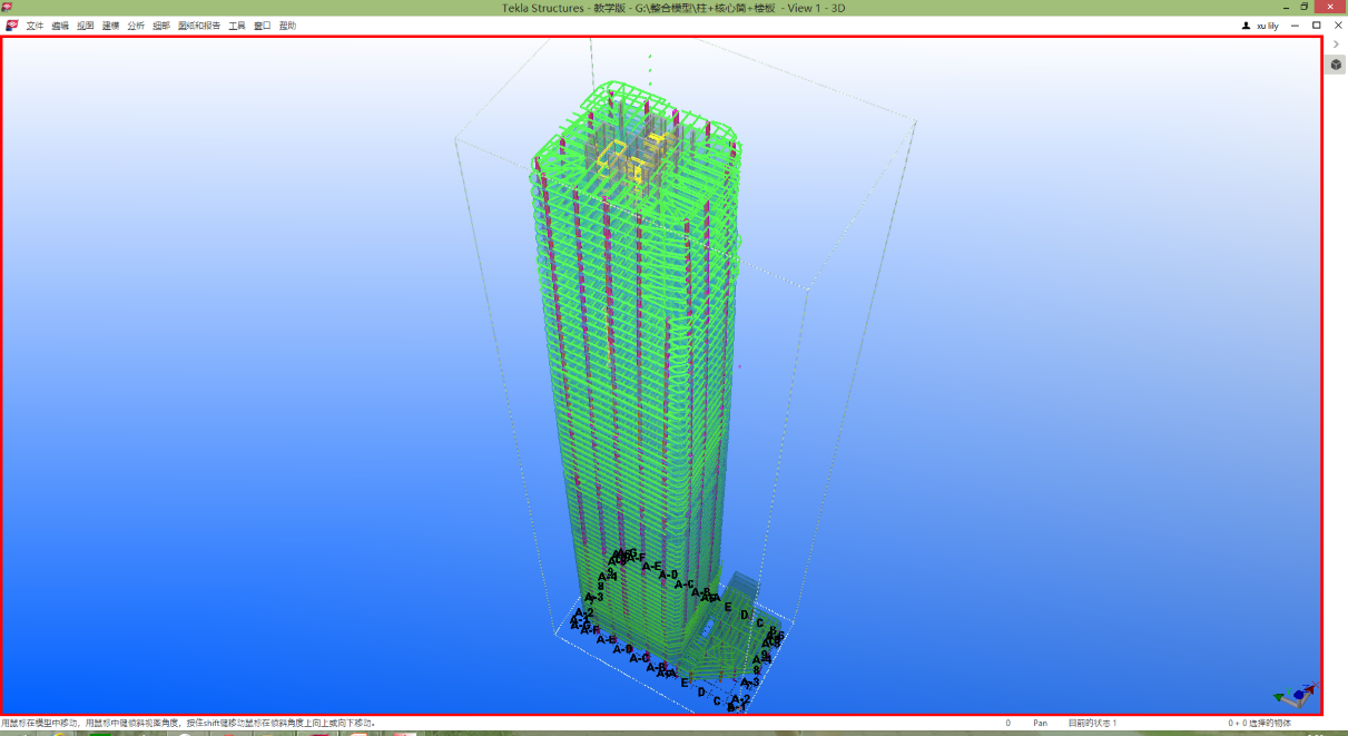 广州国际汇金中心项目素材由上海陆道工程设计管理股份有限公司(上海交大BIM研究中心合作单位)提供,五位参赛组员根据项目图纸采用多人协同的方式建立相应的TEKLA模型。汇金中心占地3.6万平方米,总建筑面积达41万平方米,属于钢管混凝土柱+钢梁框架-钢筋混凝土核心筒结构,地上69层,地下6层,房屋总高度306.0米。