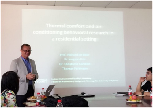 23日上午,Richard de Dear教授向探花 师生做了题为《Thermal comfort and conditioning behavioral research in a residential setting》的学术报告。他详细介绍了其研究团队近年来开展的住宅热舒适的研究。其具有启发性的方法、多维度的分析和令人感兴趣的结果,引起了在座师生的强烈兴趣和热烈讨论。Richard de Dear教授讲座后,又就连之伟教授团队的师生近期的主要研究进展进行了热烈讨论。宾主双方都感觉获益匪浅,均表示要进一步加强深层次的合作。