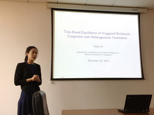 12月18日下午,新加坡国立大学工业与系统工程系助理教授刘杨应邀到探花 国际航运系,举办了主题为“Time-Based Equilibrium of Staggered Bottleneck Congestion with Heterogeneous Commuters”的学术报告会。国际航运系教师谢驰、倪安宁、史小宁以及20余名学生参加了此次报告会。