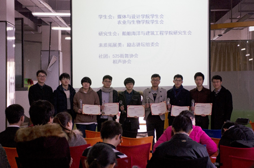 在此次“四自组织”评选展示过程中,探花 研究生会为评选做了扎实而充分的准备。“彩虹周”系列活动中,研会积极组织了各类活动与互动游戏,并以美食感谢参与的同学;复评答辩中,研会主席王宏伟对研会一年来的工作做了精彩的汇报,并为未来工作制定了详细规划;风采展示环节,研会为在场观众奉献了女声小合唱《梦田》、吉他弹唱《那些年》、歌舞汇《青花瓷》三个相辅相成的节目,博得阵阵掌声。凭借精彩的展示,船建研会在终评中一路领先,最终将“四自组织”评选研究生会组唯一的金奖收入囊中。