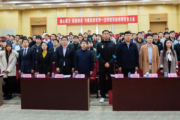 在共同奏唱国歌之后,巢睿祺老师进行了致辞。巢老师在致辞中对本次大会的召开表达了衷心的祝贺并对学生代表们提出了殷切的希望。他希望学生会持续做好改革工作,不断夯实团的基层建设,不忘初心,牢记使命,发挥共青团引领凝聚、组织动员、联系服务青年的作用。